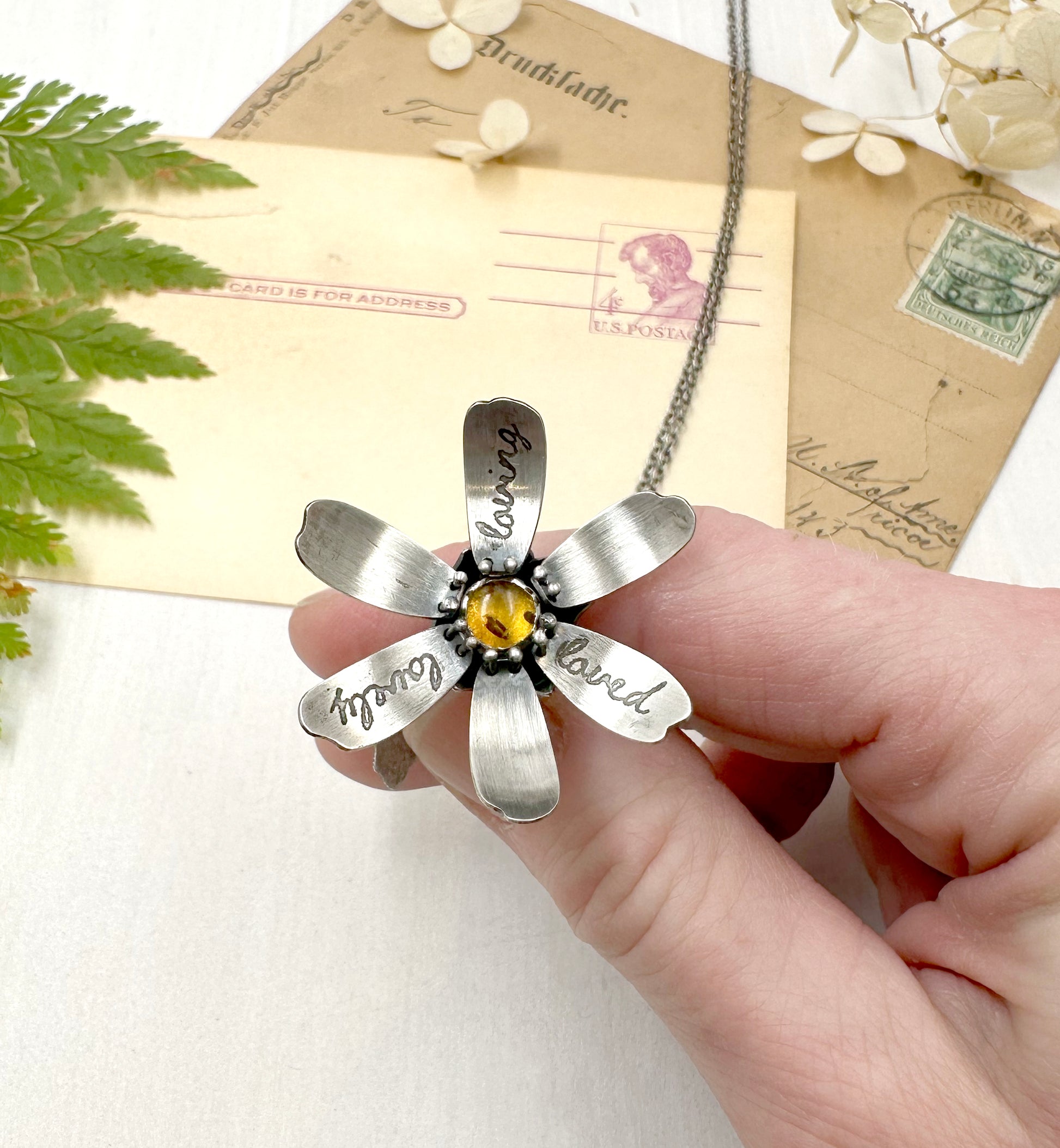 Kinetic Sterling Silver Flower with Amber, "Loving, Lovely, Loved"