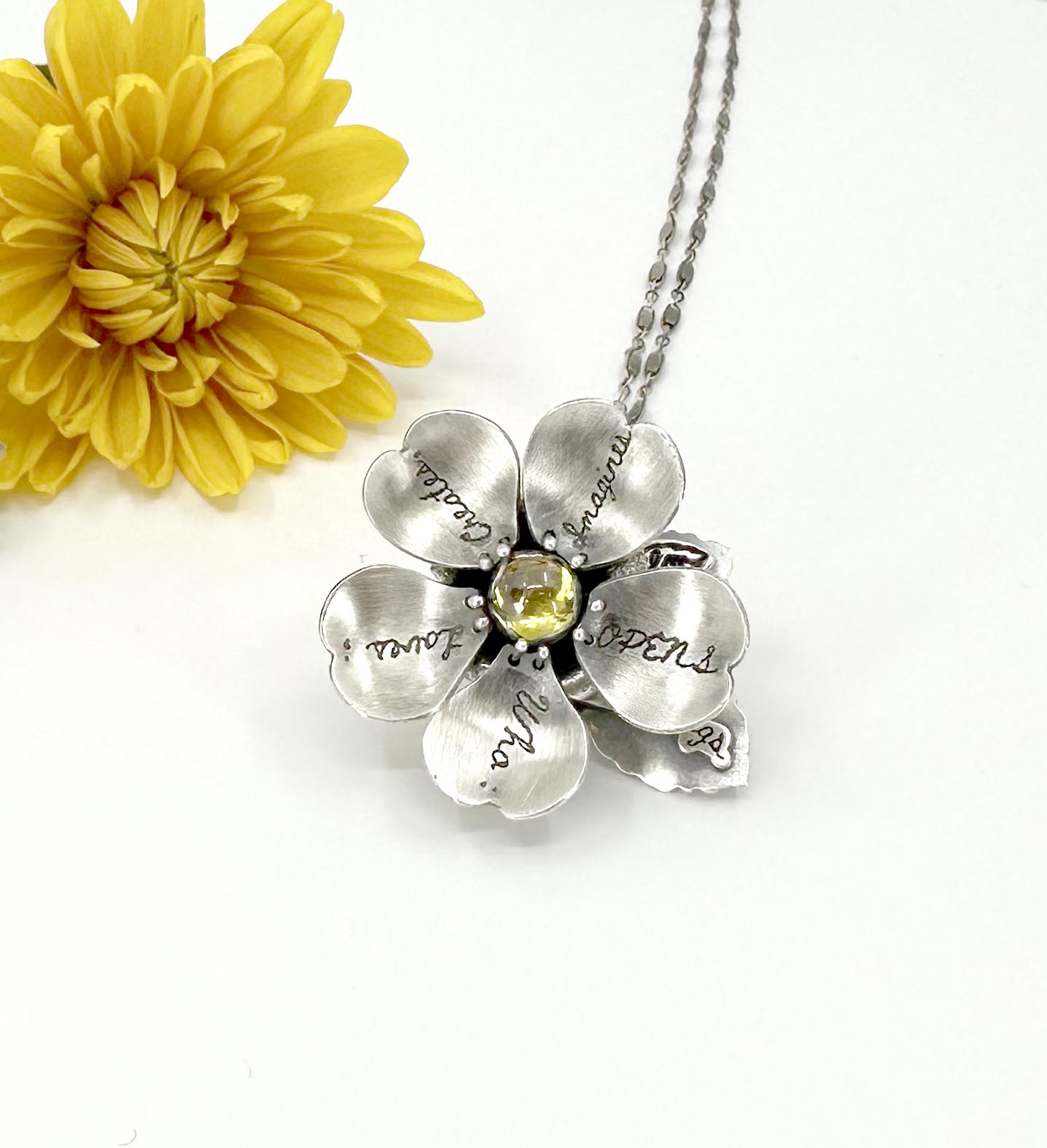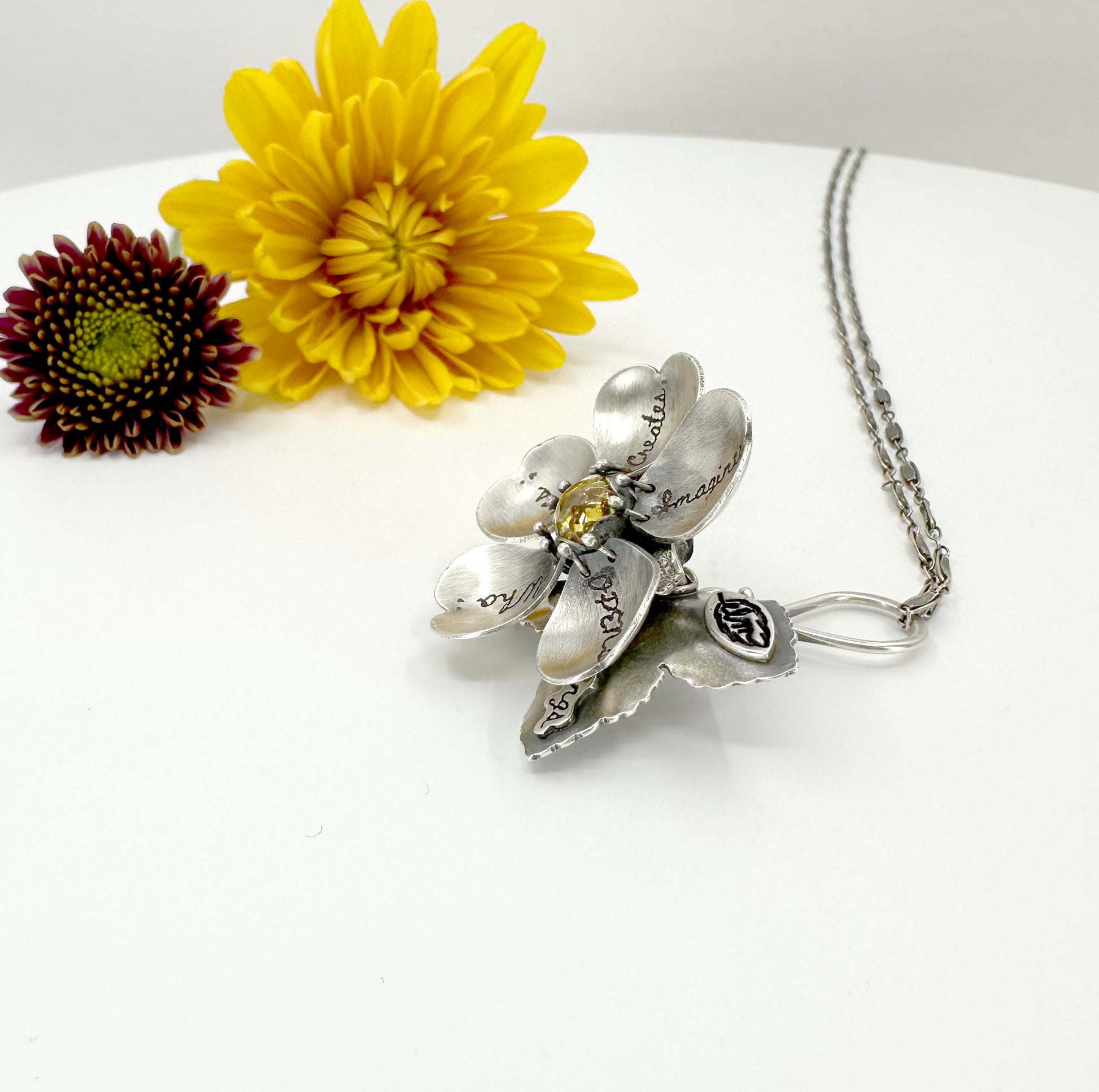 Made of sterling silver, this piece features a glowing citrine at its center, with gently curving sepals adding a whimsical touch to the top. The words of e.e. cummings are delicately etched onto the petals, with his name appearing on the leaf alongside my logo. Suspended from a dainty, vintage-inspired 22" chain, it is finished with a handmade hook clasp.