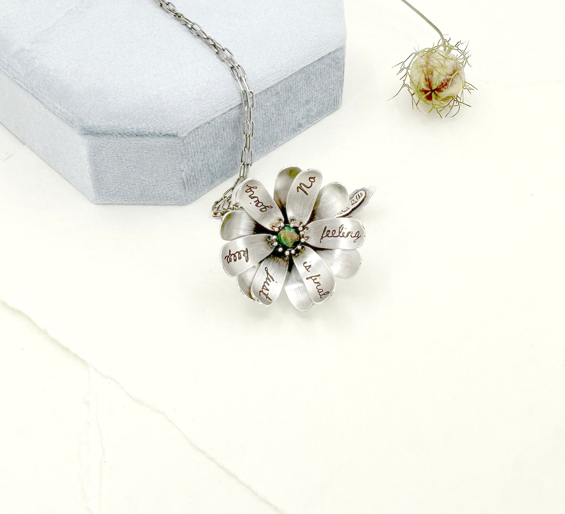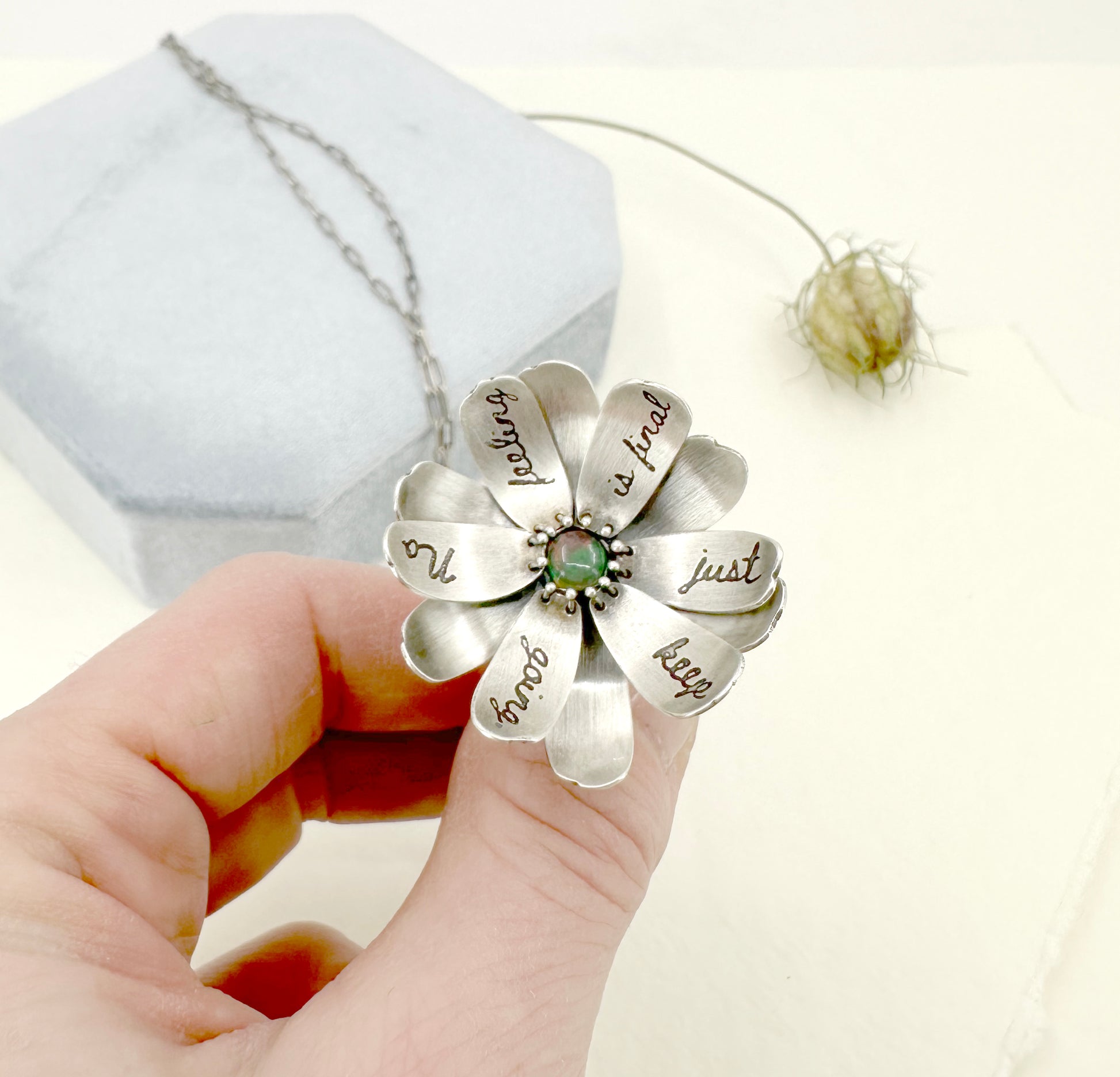 "Let everything happen..." kinetic flower with Rilke quote in sterling silver with black opal.