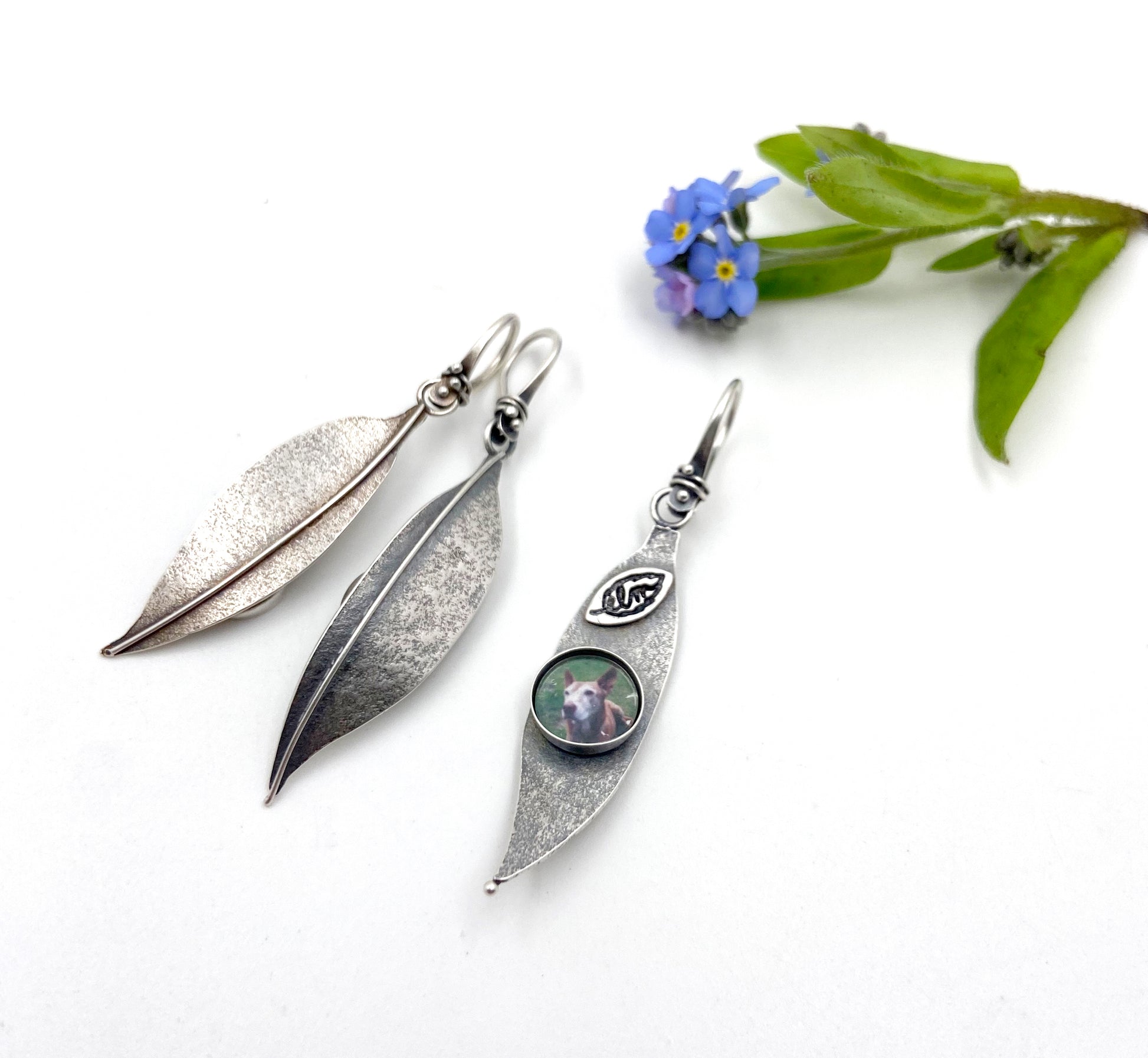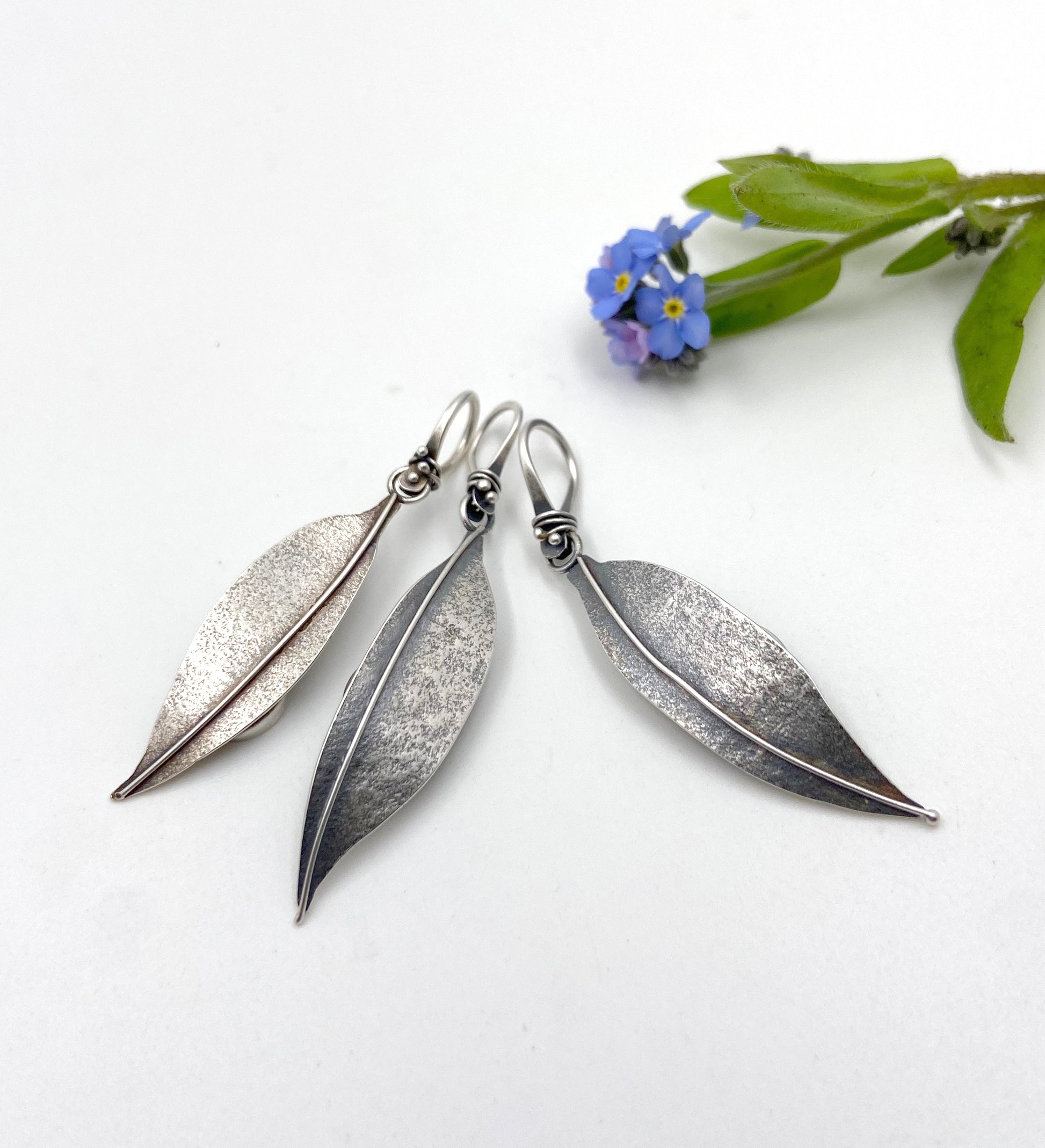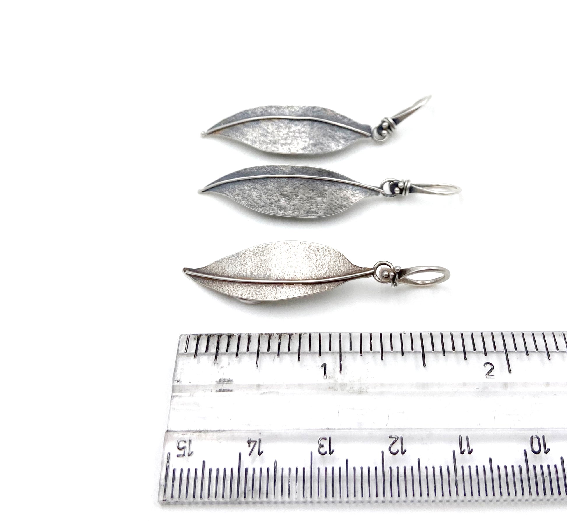 Lightly textured forget me not leaves. These can be stacked with the forget me not kinetic pendant, worn individually, or worn as a cluster.