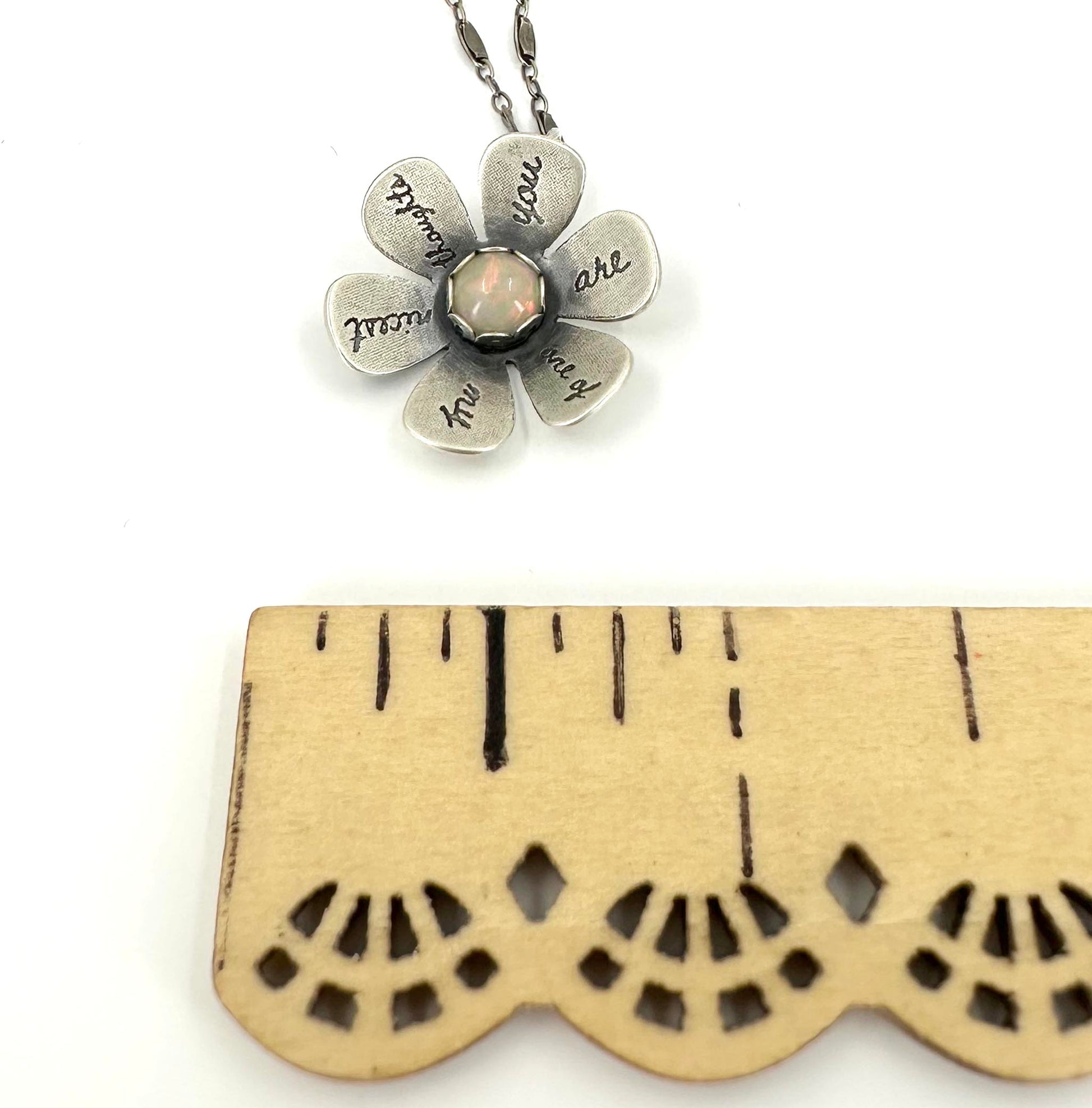 A sterling silver bloom, featuring a shimmering opal at its center. It's so challenging to capture the beauty of an opal in photographs, but this one flashes with blues and pinks and greens and is truly beautiful
