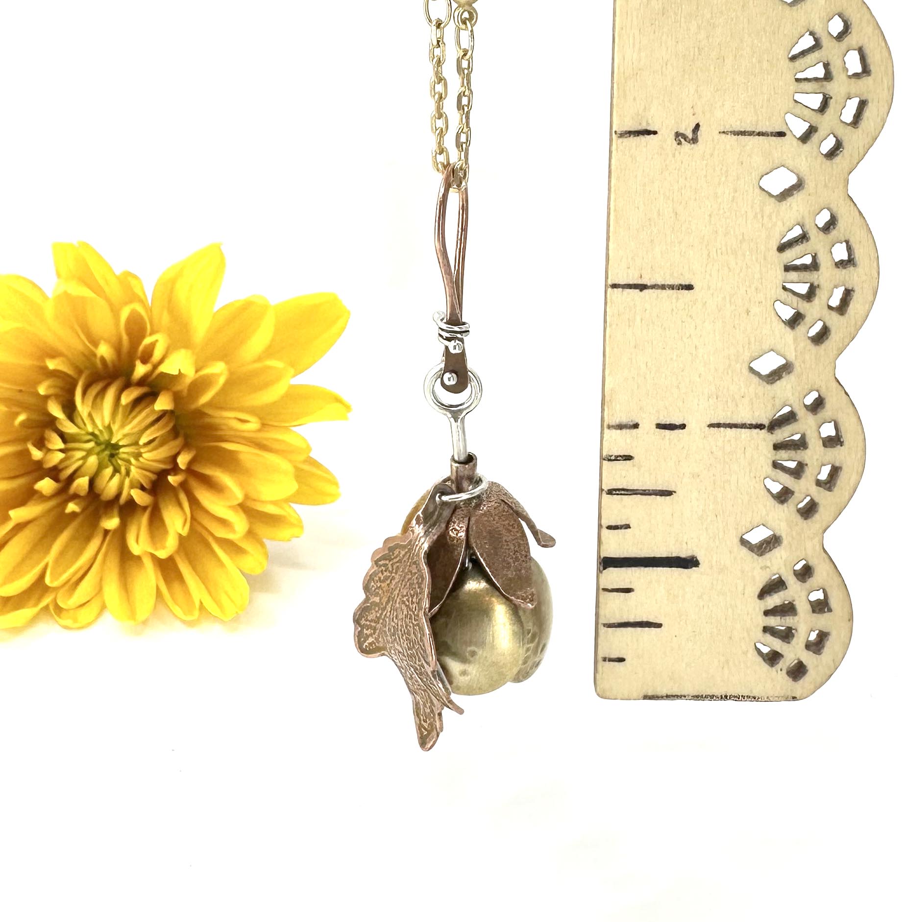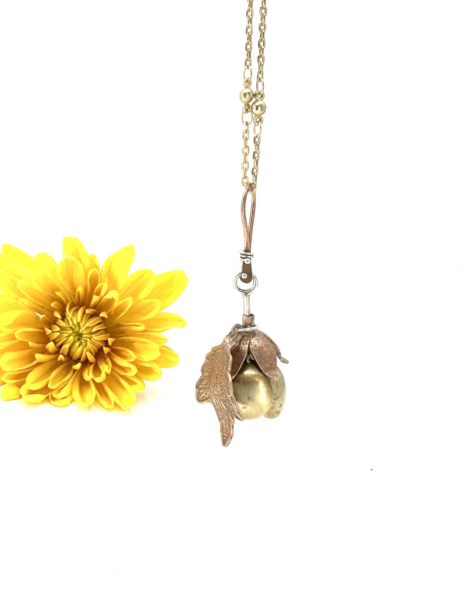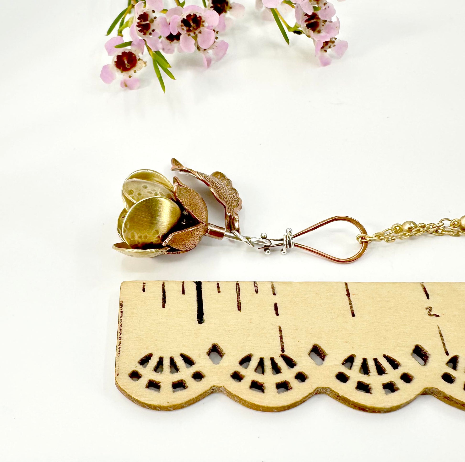 The petals were etched and textured but left plain to allow the natural patina to occur on the brass and copper.