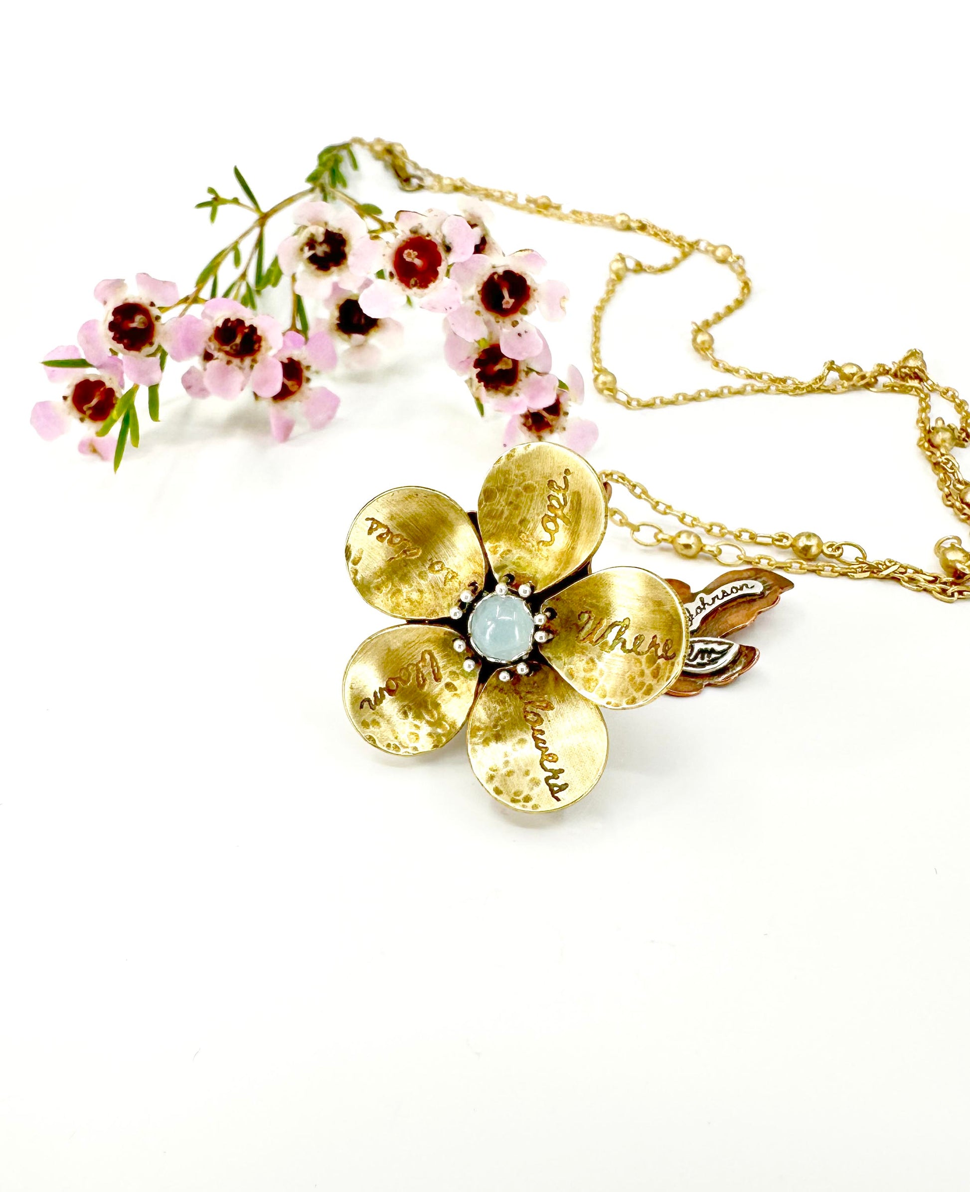 "Where Flowers Bloom" Jewelers Brass, Sterling and Aquamarine Kinetic Flower