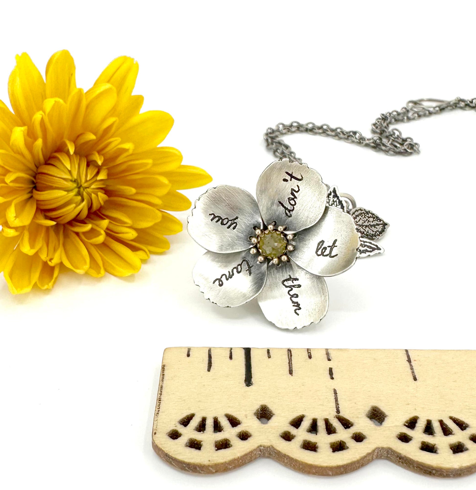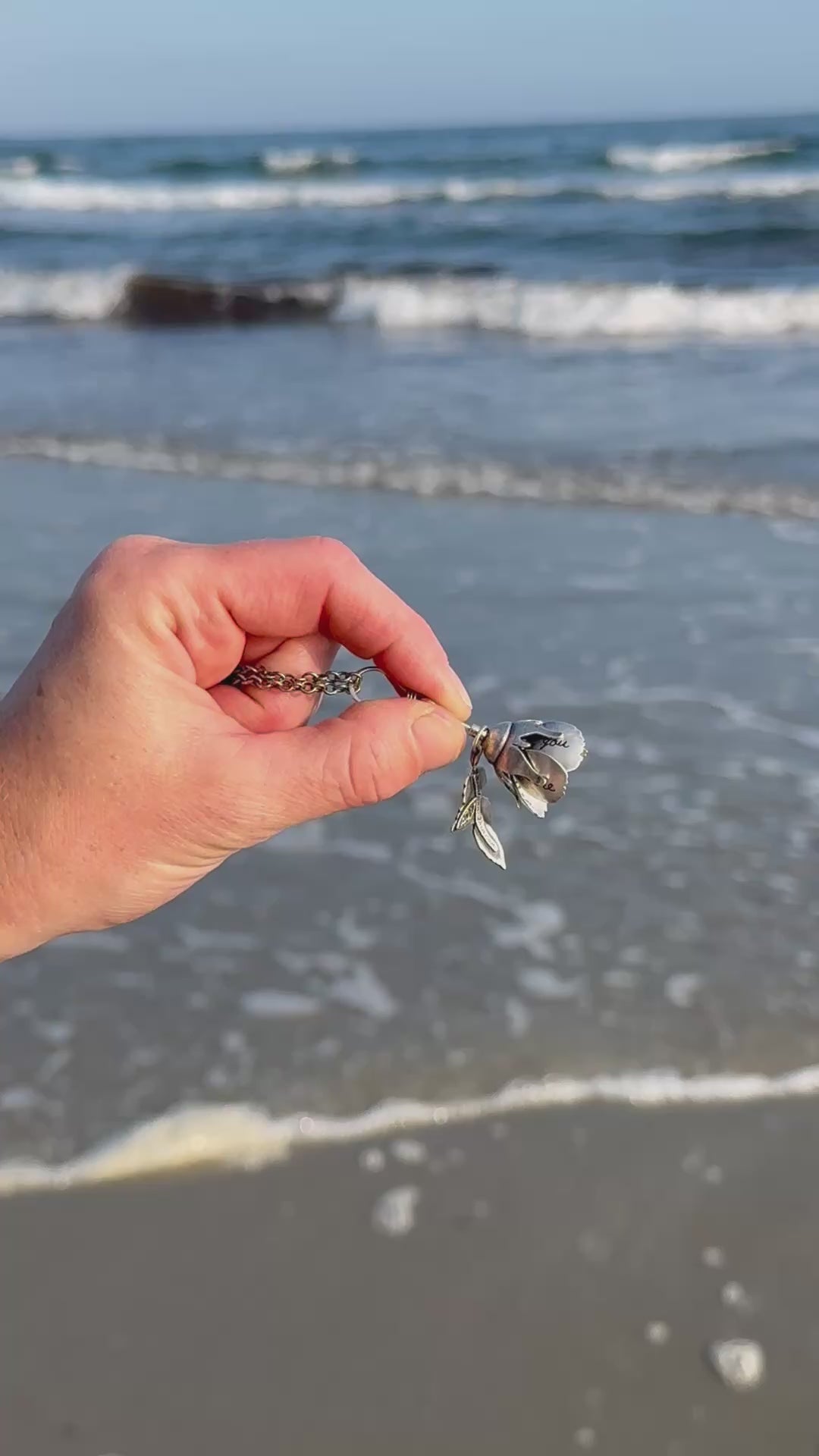 Suspended from a substantial yet delicate 22" sterling silver chain, this piece is finished with a handmade hook clasp. The author's name is etched on the rose leaf, alongside my elm logo.
